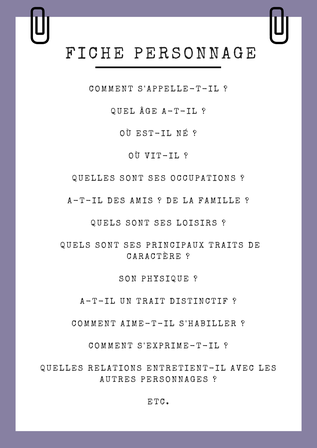 La fiche personnage a ses adeptes et ses détracteurs : je fais partie des premiers. Cette fiche n’est pas un casse-tête mais un pense-bête, une liste de questions auxquelles l’auteur doit répondre pour cerner ses personnages, les comprendre. Les informations seront dans l’idéal les plus exhaustives possible et qu’importe si toutes ne trouveront pas leur place dans l’histoire. A minima une fiche personnage doit mentionner :